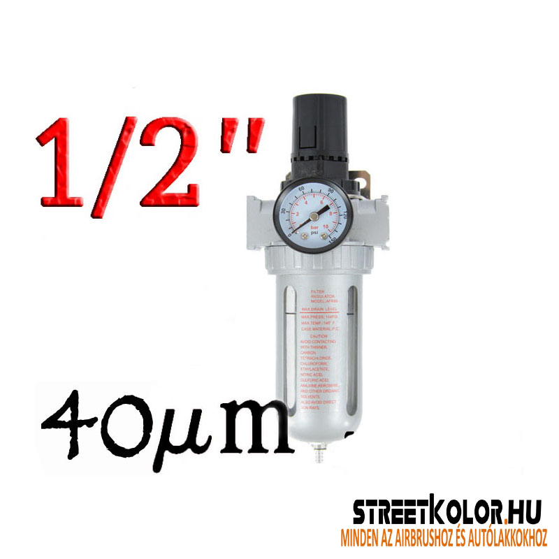 Professzionális légnyomásszabályozó alumínium kivitelben. A sűrített levegős rendszerekben előfordul a szennyeződés, például vízzel vagy vízgőzzel. Ezen nem kívánt részecskék eltávolítására ebben a rendszerben szűrőt található. Ez a szűrő a levegő szűrésére és szárítására szolgál. Ez minden pneumatikus rendszer alapvető eleme. Ennek a szűrőnek a használatával megakadályozhatja, hogy többek között rozsdás szerszámalkatrészek, festék, por, sérült tömlők stb. kerüljenek a szórópisztolyába. A szűrő közvetlenül a kompresszorhoz és bármely további nyomásszabályozóhoz csatlakozik. A szűrő alján található szelep megnyomásával engedje le a vizet. Az olajat és más szennyeződéseket is kiszűri. Bármely 10 bar alatti nyomású pneumatikus rendszerhez alkalmas. A teljesen finom szűrésnek köszönhetően minden finom szennyeződést kiszűrhet. Ez a szűrővel ellátott légnyomásszabályozó egy többlépcsős légszűrő rendszer középső vagy utolsó (utolsó) elemeként is használható.